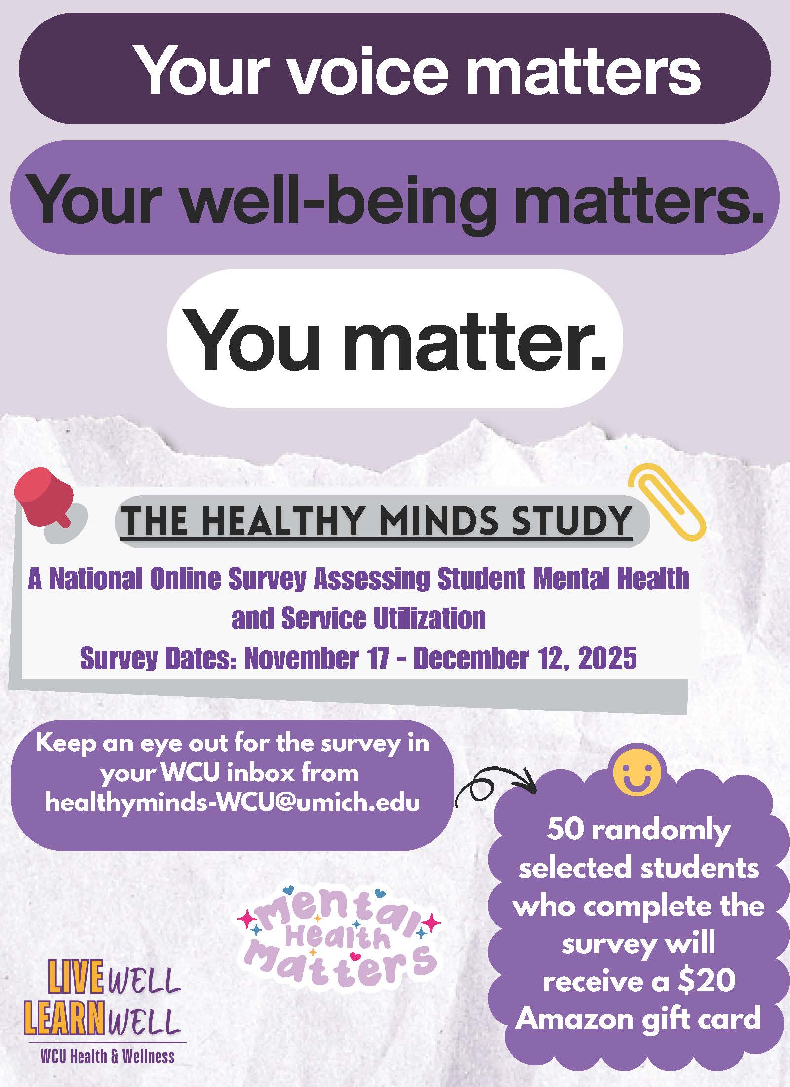 West Chester University launched the Healthy Minds Study to better understand the state of our students’ well-being, identify areas of growth within our existing systems, and inform future efforts.  All students were invited to participate in the study and received an email to their WCU email account from healthyminds-wcu@umich.edu on November 17, 2025.  The study will remain open through December 12, 2025.  All students who participate in the study will be entered to win one of 50, $20 Amazon gift cards.  Questions about the Healthy Minds Study can be directed to Jayme Trogus, Wellness Promotion, at jtrogus@wcupa.edu